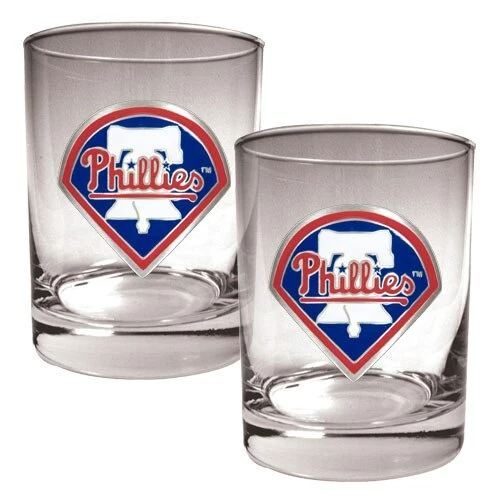 The officially licensed MLB Philadelphia Phillies 2-piece rocks glass set by Great American Products is decorated with hand-crafted Metal Team Logos. Itβs the perfect complement to your bar or game room dΓ©cor. Hand Wash. Dimensions: 4.5βH x 3βW x 4.5βD.