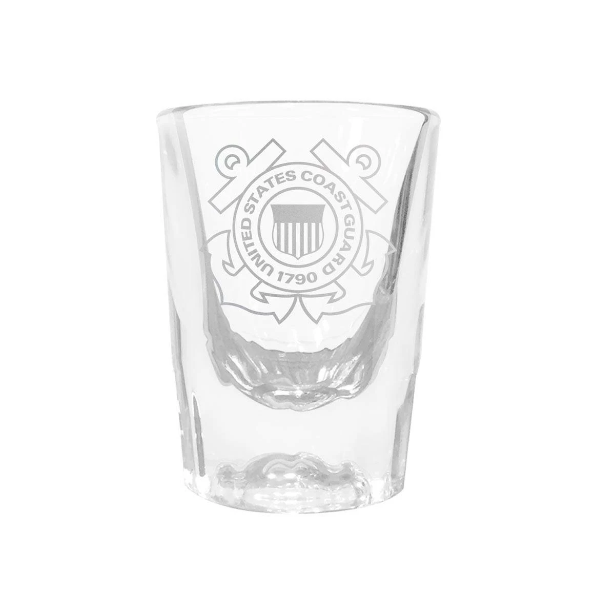 The U.S. Coast Guard prism shot glass is 2 ounces and features laser-etched graphics. Manufactured by Great American Products.