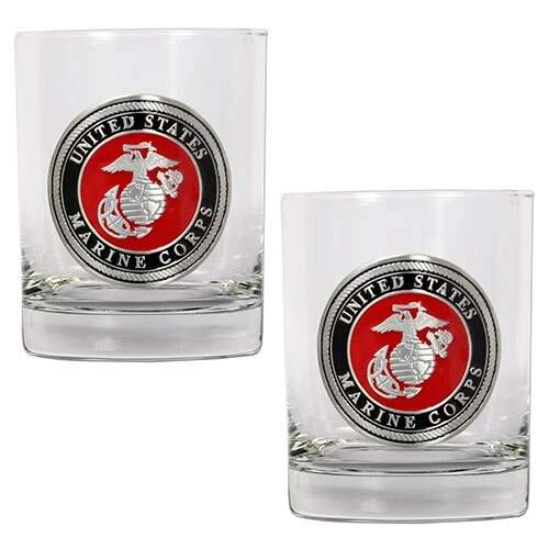 The U.S. Military U.S. Marines set of Officially Licensed Rocks Glasses decorated with hand-crafted metal emblems. These 14oz. glasses are the perfect complement to your bar or game room decor. Manufactured by Great American Products. Hand wash. Dimensions: 4.5”H x 3”W x 4.5”D.
