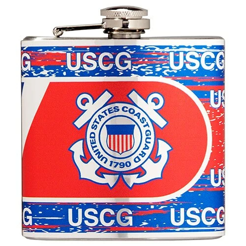 The U.S. Military U.S. Coast Guard 6 ounce stainless steel hip flask is officially licensed and decorated with high-definition metallic graphics. Manufactured by Great American Products. Hand wash.