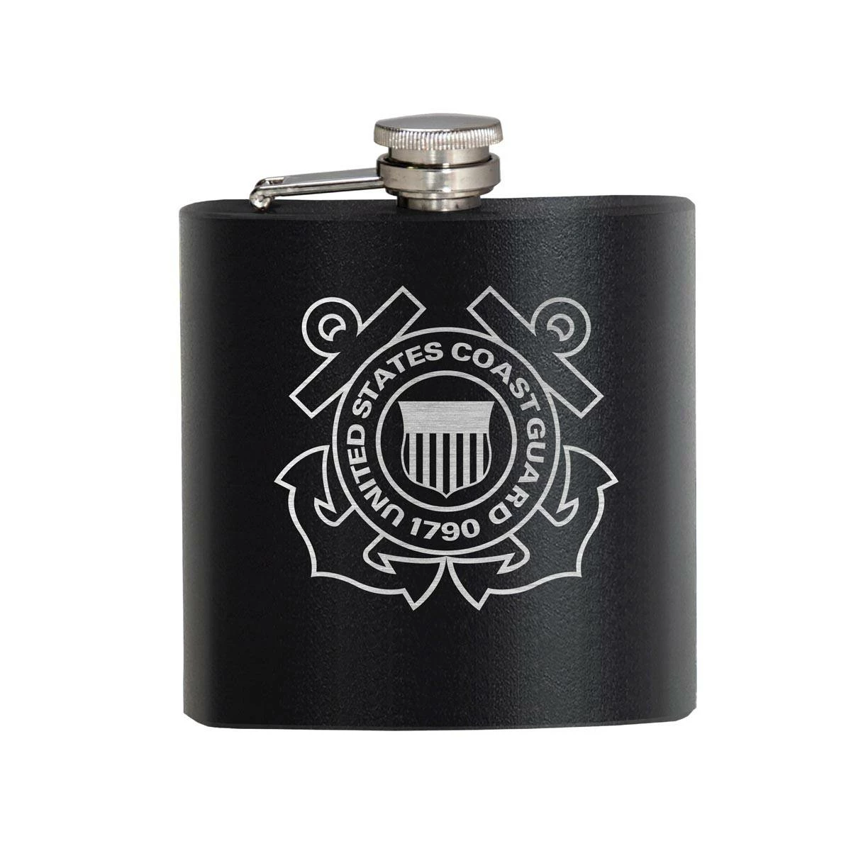 The U.S. Coast Guard 6-ounce stealth hip flask is powder coated in black matte. Curved design to fit comfortably against the hip. Features laser etched graphics. Manufactured by Great American Products.