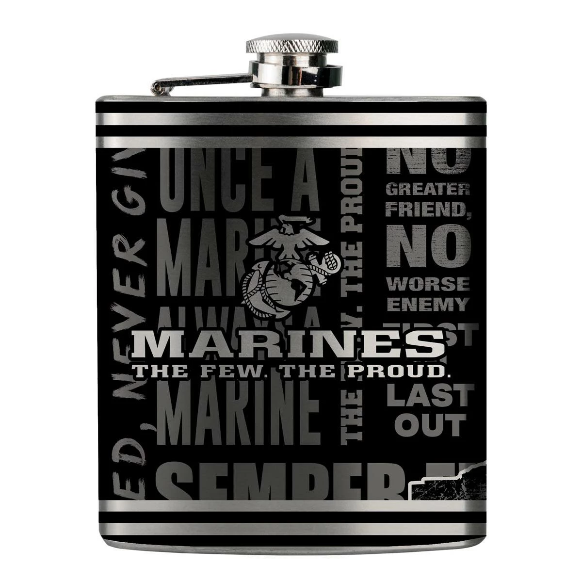 The U.S. Marines 6-ounce hip flask is stainless steel. It has a curved design to fit comfortably against the hip area. Features 360-degree graphics. Manufactured by Great American Products.