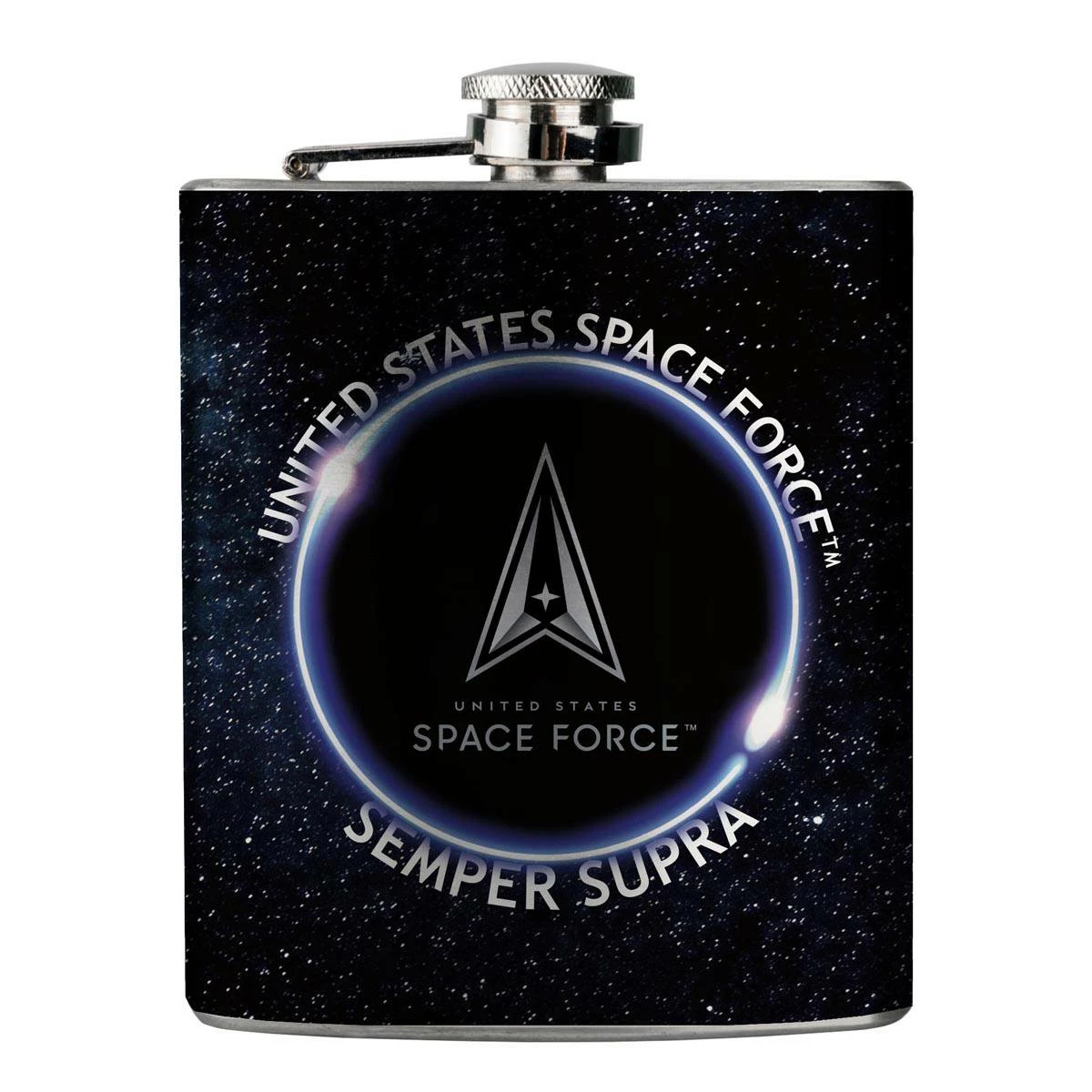 The 6-ounce hip flask is stainless steel. It has a curved design to fit comfortably against the hip area. Features 360-degree graphics. Manufactured by Great American Products.