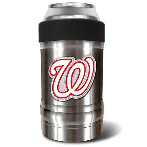 This MLB Washington Nationals vacuum insulated can holder is double-wall vacuum insulated and is made to keep your favorite beverage icy cold from start to finish. Its design features an ergonomic grip with a screw on color accented collar that locks in your beverage container and keeps the perfect temperature for optimal drinking pleasure. Manufactured by Great American Products.