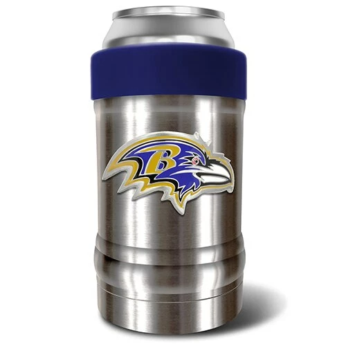This NFL Baltimore Ravens vacuum insulated can holder is double-wall vacuum insulated and is made to keep your favorite beverage icy cold from start to finish. Its design features an ergonomic grip with a screw on color accented collar that locks in your beverage container and keeps the perfect temperature for optimal drinking pleasure. Manufactured by Great American Products. Made with 18/8 kitchen grade stainless steel.
