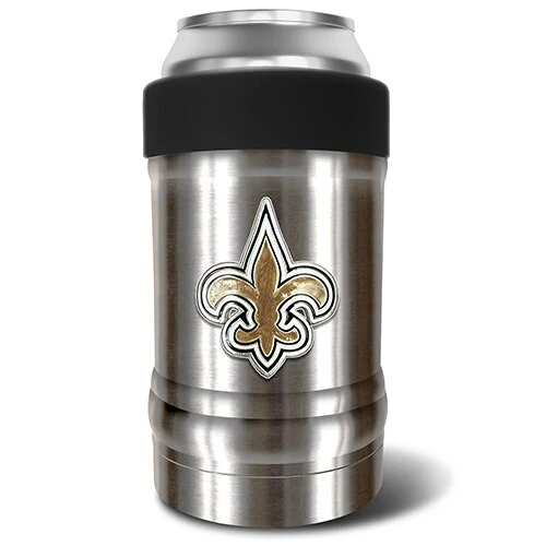 This NFL New Orleans Saints vacuum insulated can holder is double-wall vacuum insulated and is made to keep your favorite beverage icy cold from start to finish. Its design features an ergonomic grip with a screw on color accented collar that locks in your beverage container and keeps the perfect temperature for optimal drinking pleasure. Manufactured by Great American Products. Made with 18/8 kitchen grade stainless steel.