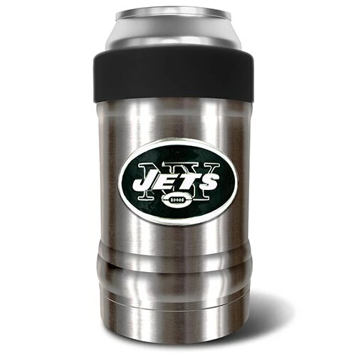 This NFL New York Jets vacuum insulated can holder is double-wall vacuum insulated and is made to keep your favorite beverage icy cold from start to finish. Its design features an ergonomic grip with a screw on color accented collar that locks in your beverage container and keeps the perfect temperature for optimal drinking pleasure. Manufactured by Great American Products. Made with 18/8 kitchen grade stainless steel.
