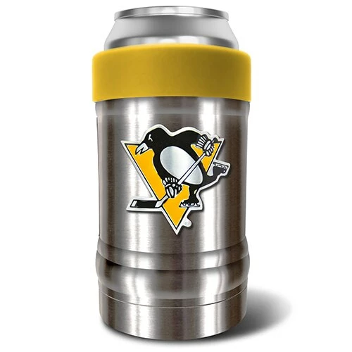 This NHL Pittsburgh Penguins vacuum insulated can holder is double-wall vacuum insulated and is made to keep your favorite beverage icy cold from start to finish. Its design features an ergonomic grip with a screw on color accented collar that locks in your beverage container and keeps the perfect temperature for optimal drinking pleasure. Manufactured by Great American Products. Made with 18/8 kitchen grade stainless steel.