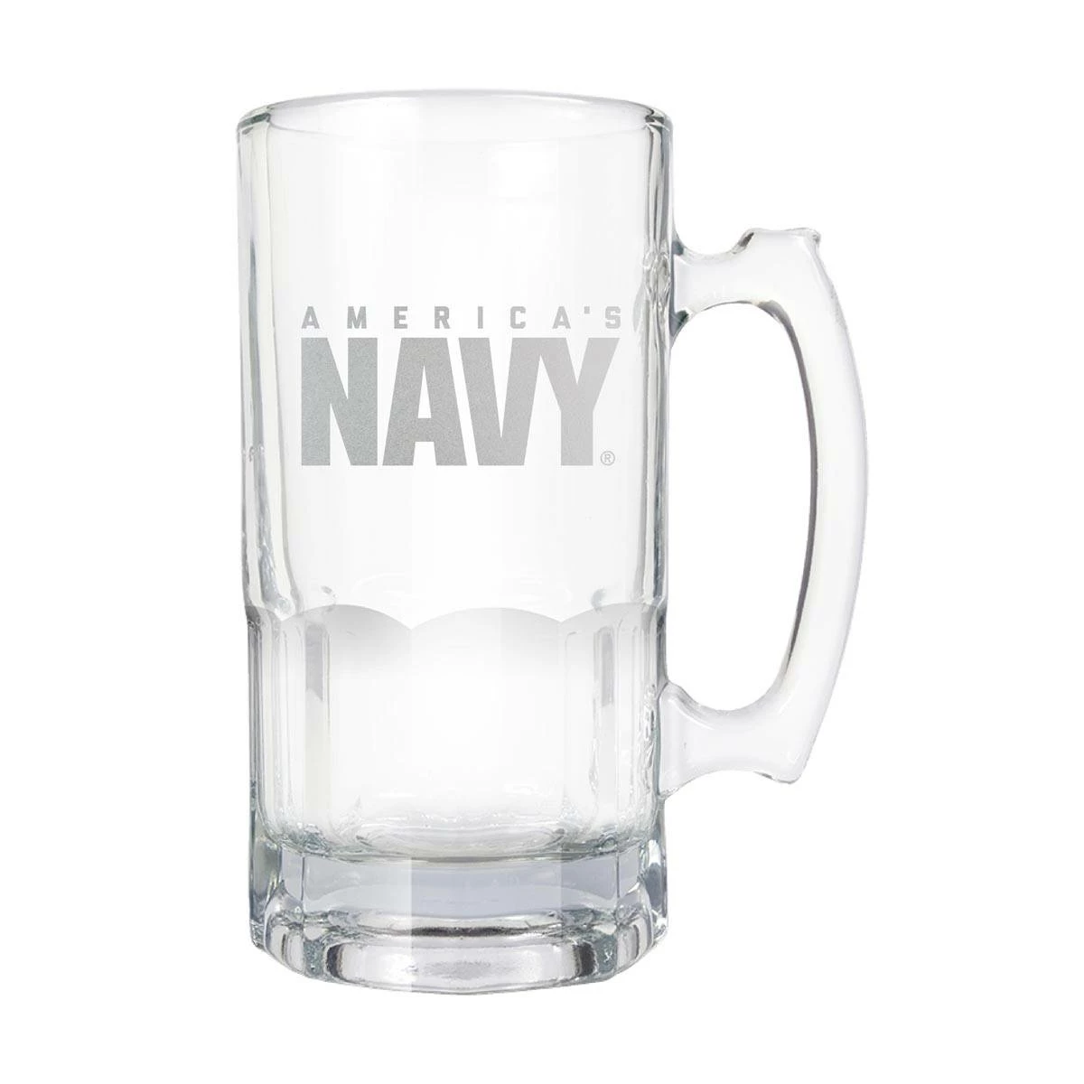 The U.S. Navy macho mug is the largest glass mug holding 1 liter of awesome goodness. Features laser etched graphics. Manufactured by Great American Products.