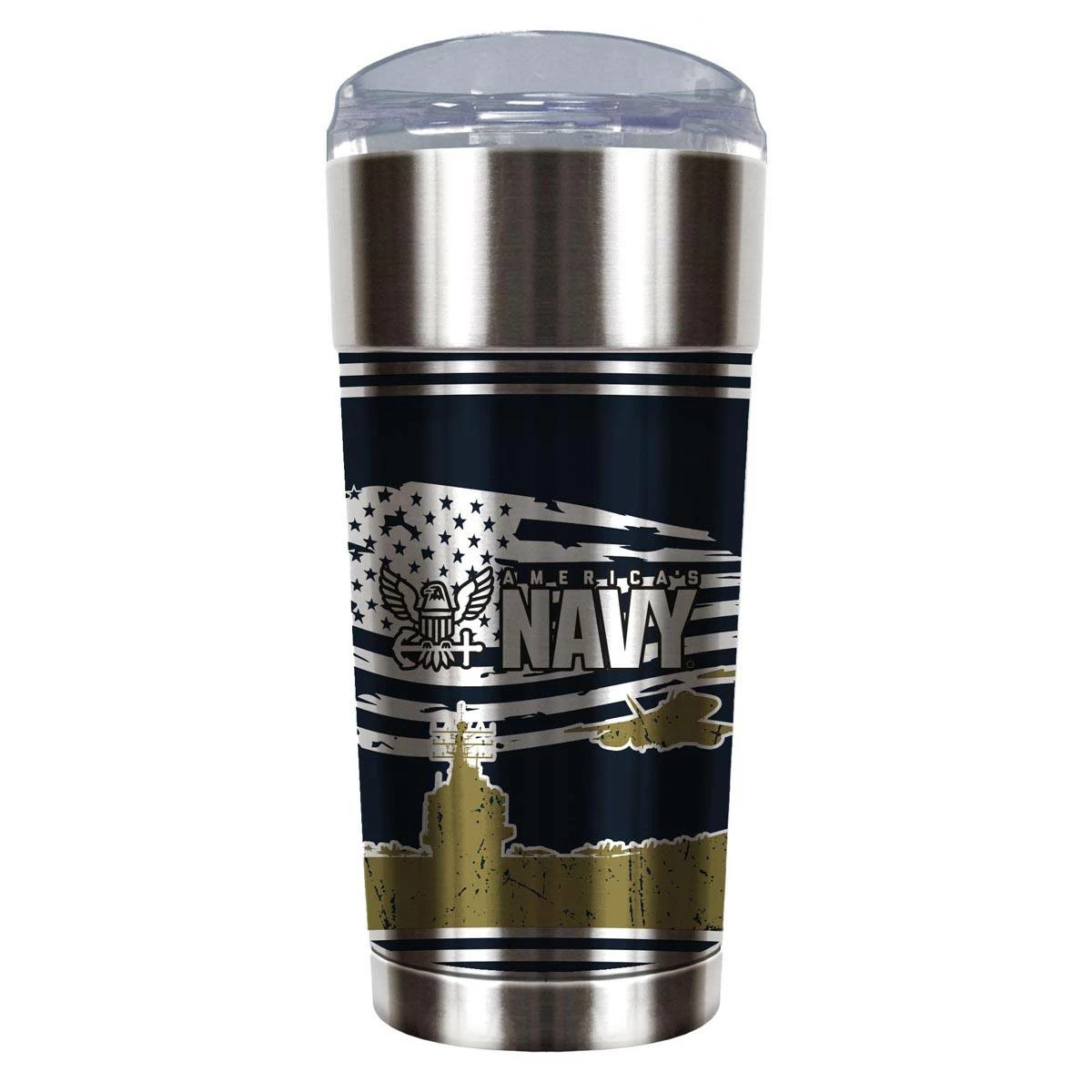 The U. S. Army 24-ounce eagle tumbler is vacuum insulated and features 360 graphics. Includes acrylic lid. Manufactured by Great American Products.