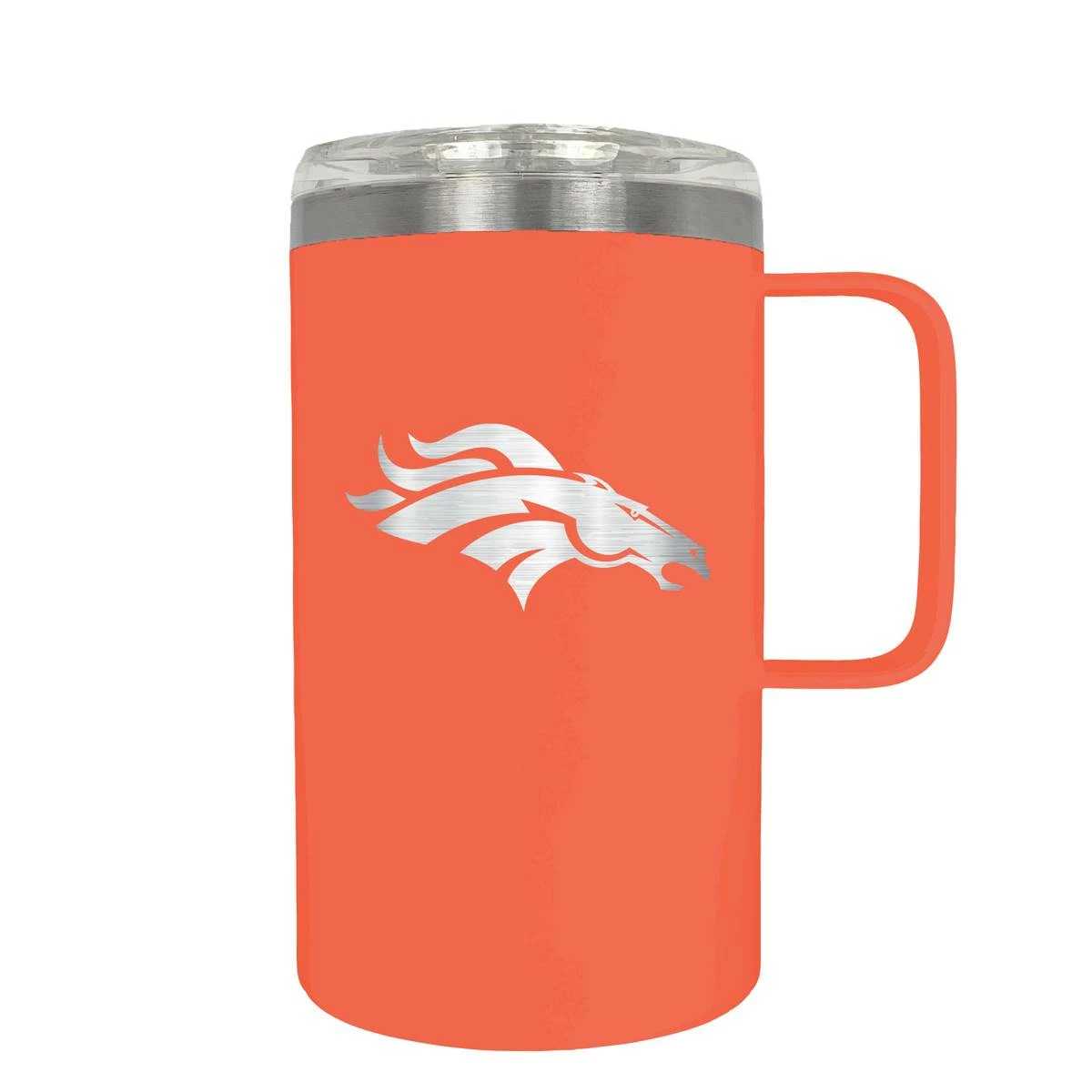 This Great American Products 18-ounce Denver Broncos hustle mug comes in team colors so you can show your team pride wherever you go. It is made of vacuum insulated stainless steel with a spill-resistant lid and features laser etched team graphics.