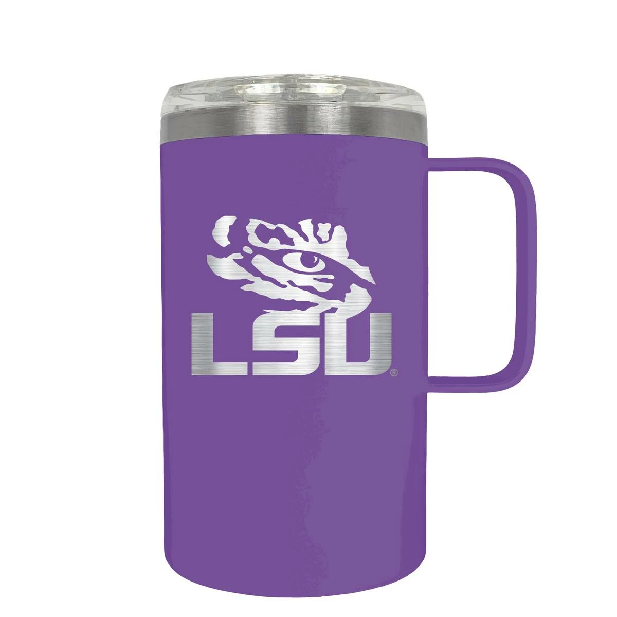 This Great American Products 18-ounce LSU Tigers hustle mug comes in team colors so you can show your team pride wherever you go. It is made of vacuum insulated stainless steel with a spill-resistant lid and features laser etched team graphics.