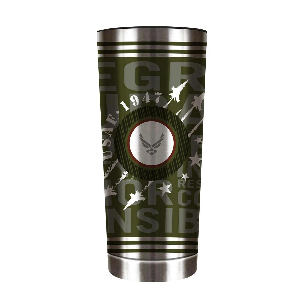 This U.S. Air Force roadie tumbler is 18 ounces and is vacuum insulated. Features 360-degree graphics and includes an acrylic lid. Manufactured by Great American Products.