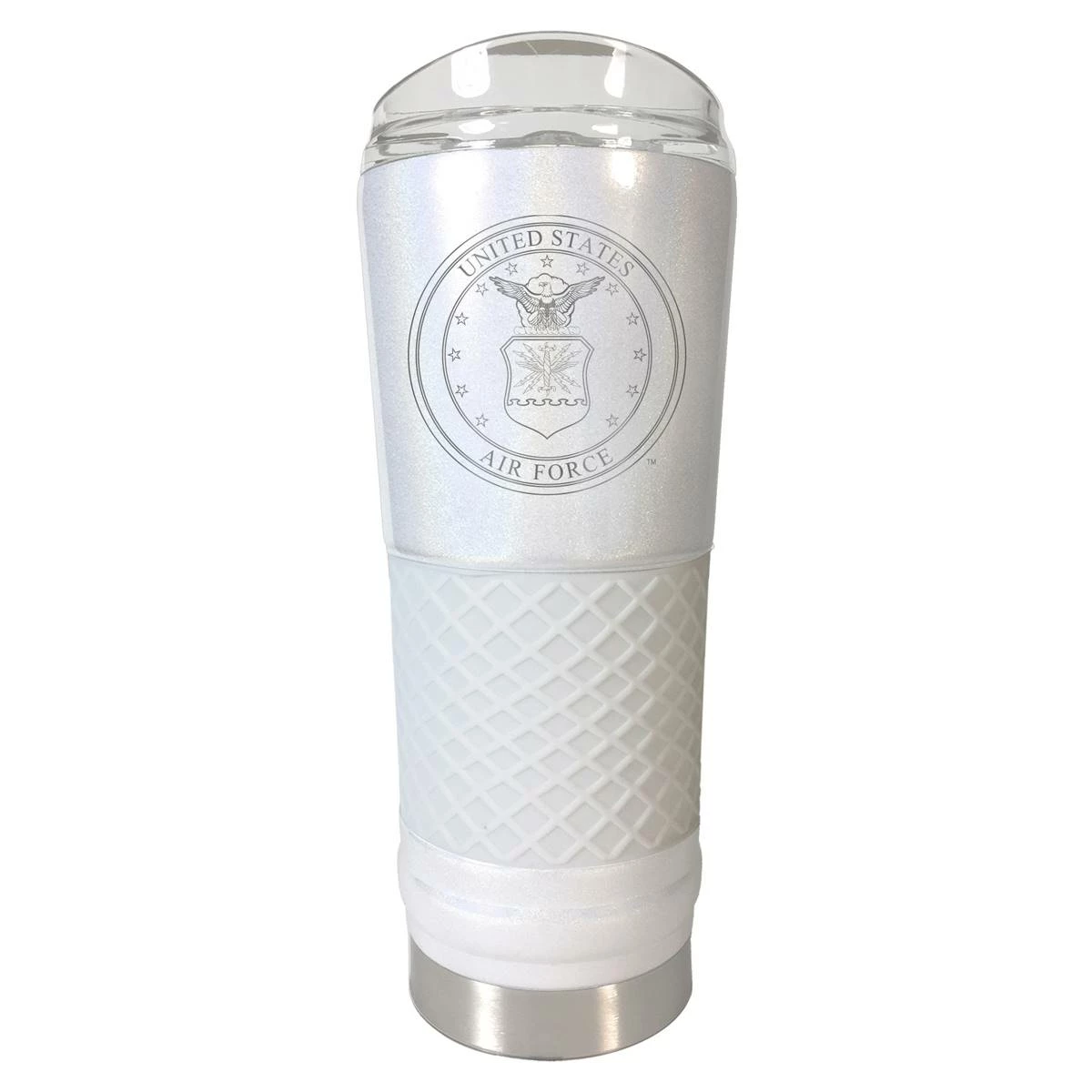 The U.S. Air Force 24-ounce opal draft tumbler is powder coated, vacuum insulated, and features laser-etched graphics. Includes acrylic lid and silicone grip. Manufactured by Great American Products.