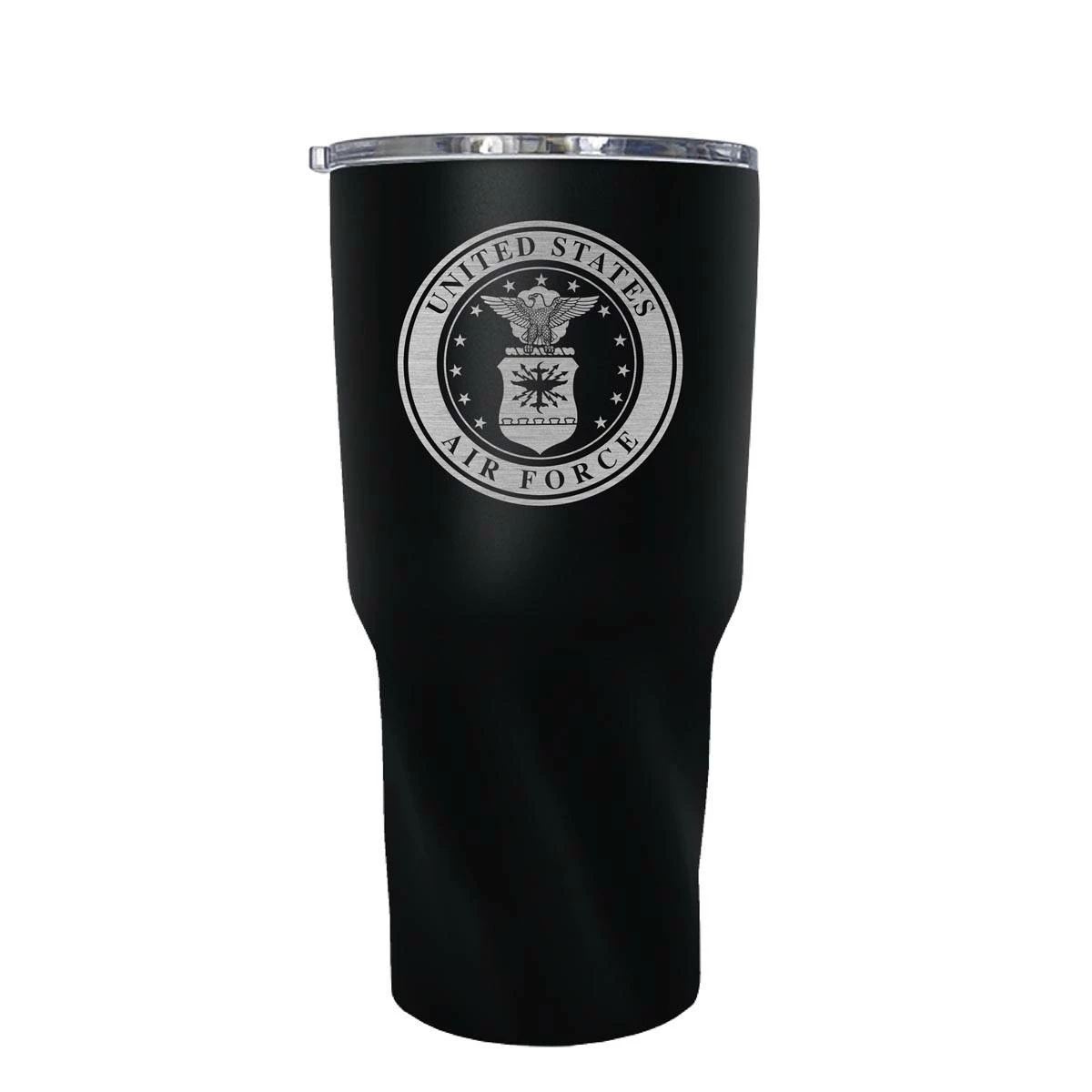The U.S. Air Force twist tumbler is 30 ounces and vacuum insulated. Powder coated in branch color with acrylic lid, the twist features laser etched graphics. Manufactured by Great American Products.