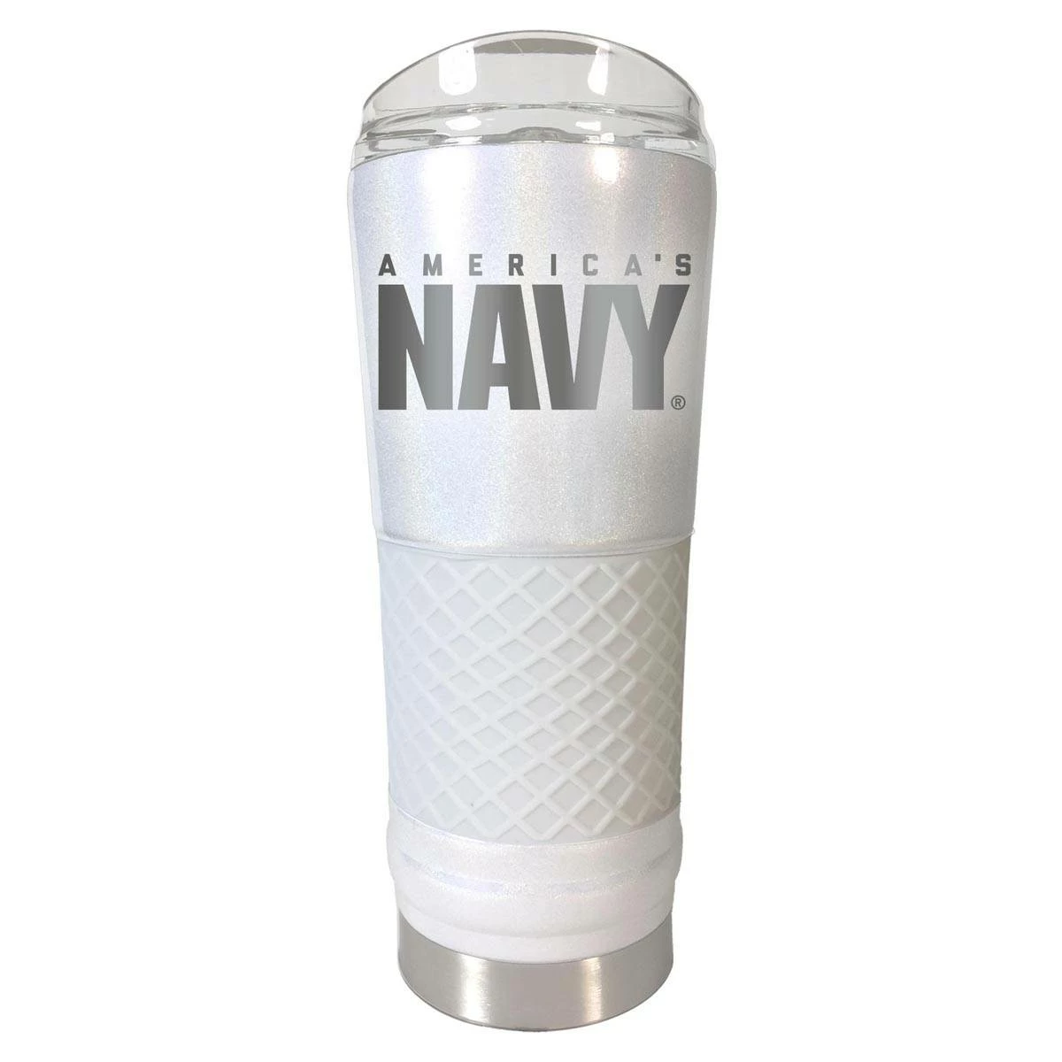 The U.S. Navy 24-ounce opal draft tumbler is powder coated, vacuum insulated, and features laser-etched graphics. Includes acrylic lid and silicone grip. Manufactured by Great American Products.