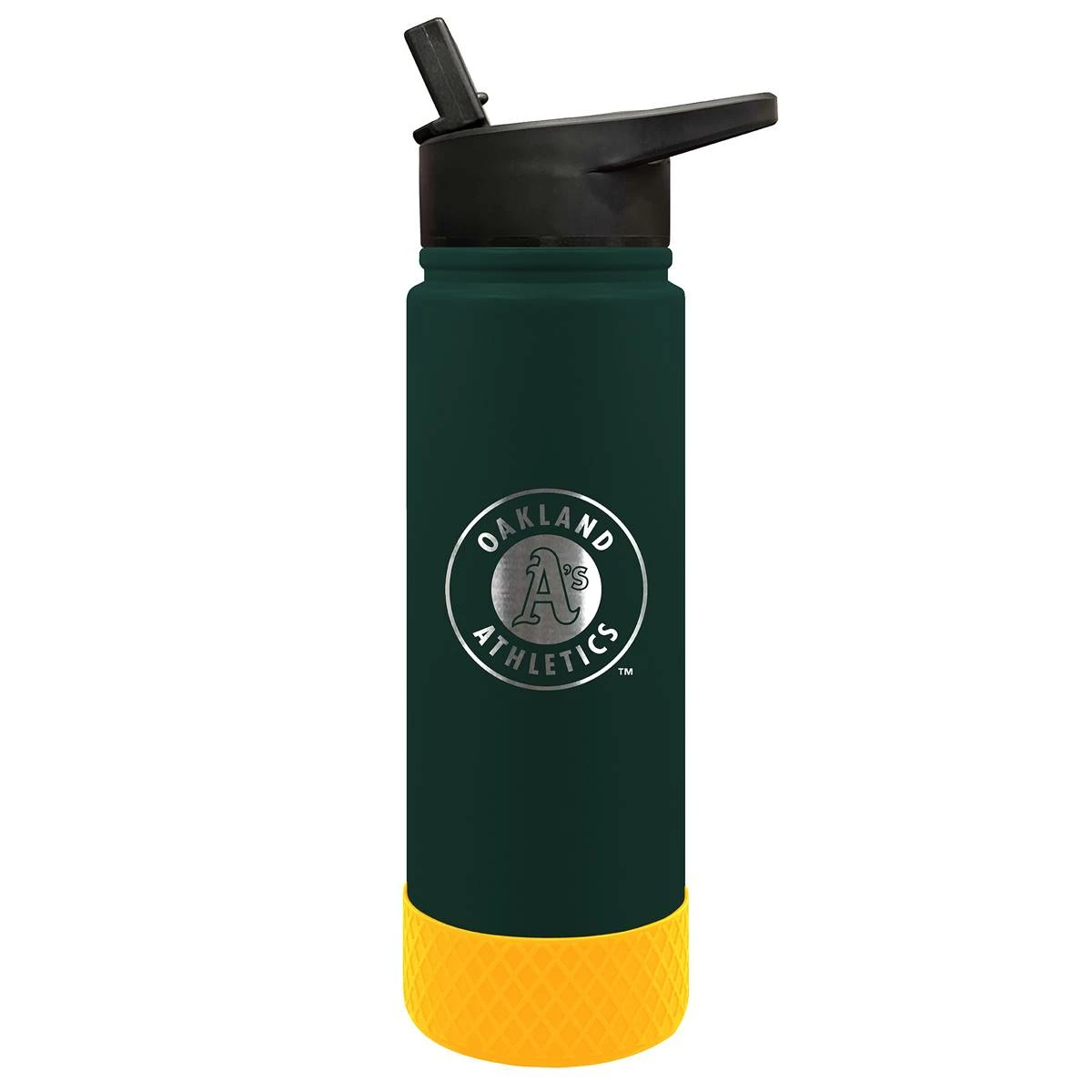 This Great American Products 24-ounce Jr. Oakland Athletics water bottle comes in team colors so you can show your team pride wherever you go. It is made of vacuum insulated stainless steel with a coordinating silicone base and laser etched team graphics.