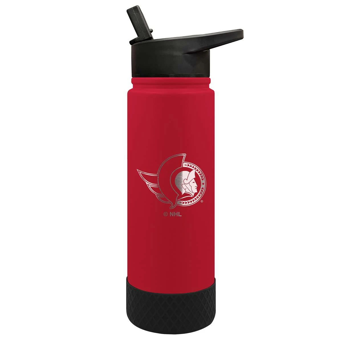 This Great American Products 24-ounce Jr. Ottawa Senators water bottle comes in team colors so you can show your team pride wherever you go. It is made of vacuum insulated stainless steel with a coordinating silicone base and laser etched team graphics.