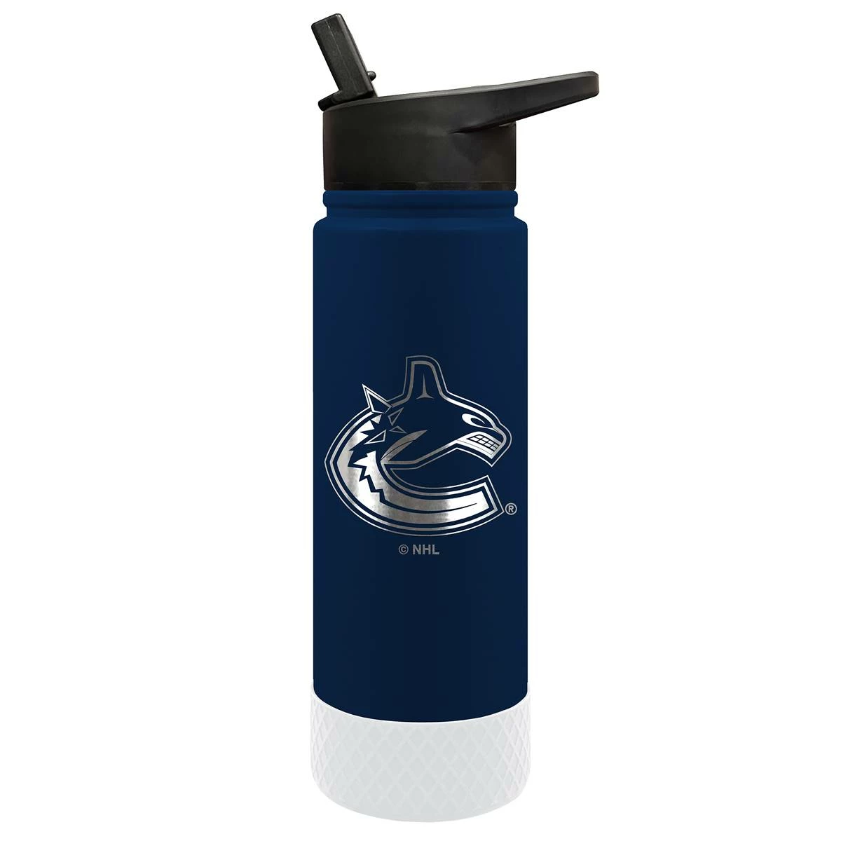 This Great American Products 24-ounce Jr. Vancouver Canucks water bottle comes in team colors so you can show your team pride wherever you go. It is made of vacuum insulated stainless steel with a coordinating silicone base and laser etched team graphics.