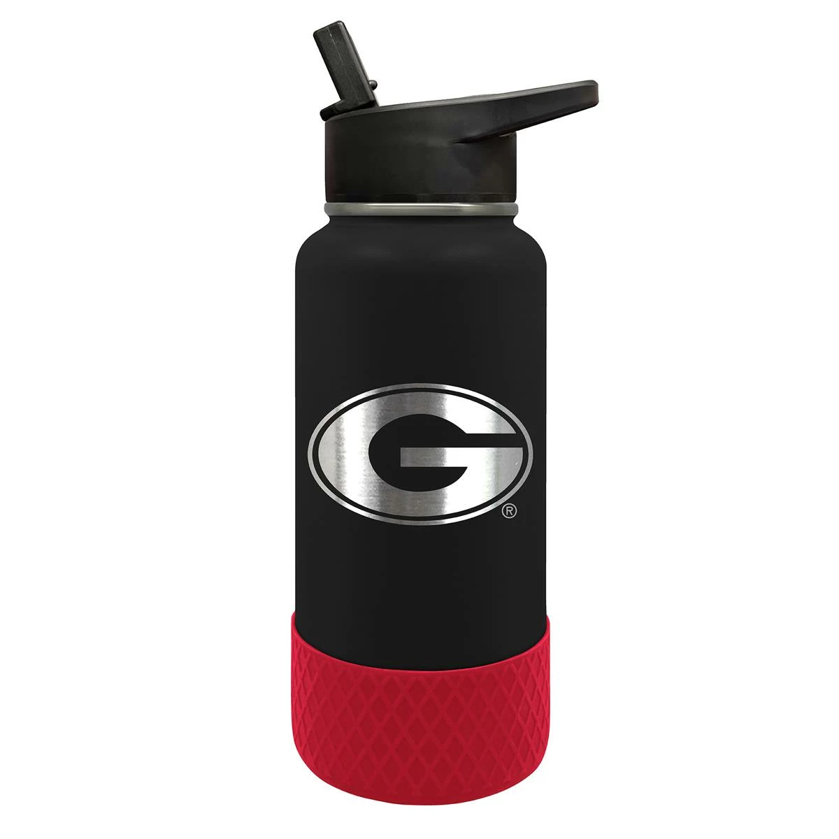 This Great American Products 32-ounce Georgia Bulldogs water bottle comes in team colors so you can show your team pride wherever you go. It is made of vacuum insulated stainless steel with a coordinating silicone base and laser etched team graphics.