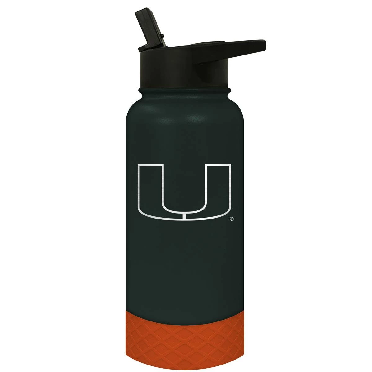 This Great American Products 32-ounce Miami Hurricanes water bottle comes in team colors so you can show your team pride wherever you go. It is made of vacuum insulated stainless steel with a coordinating silicone base and laser etched team graphics.