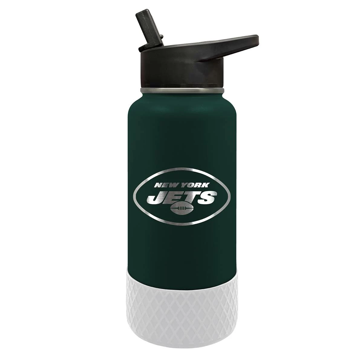 This Great American Products 32-ounce New York Jets water bottle comes in team colors so you can show your team pride wherever you go. It is made of vacuum insulated stainless steel with a coordinating silicone base and laser etched team graphics.