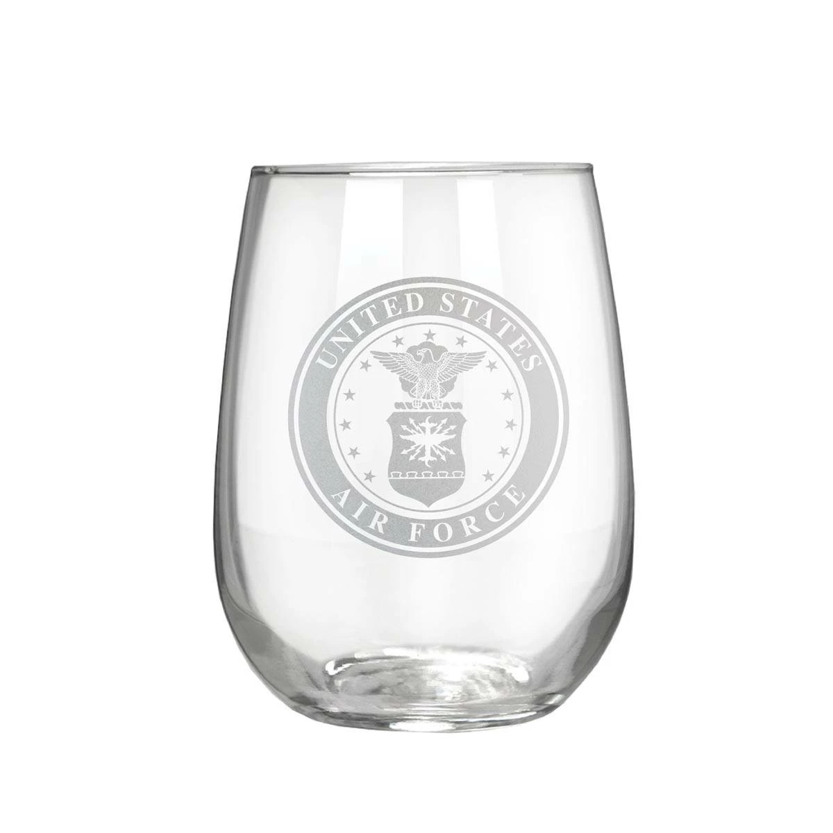 This U.S. Air Force stemless wine glass is 17 ounces and features laser etched graphics. Manufactured by Great American Products.