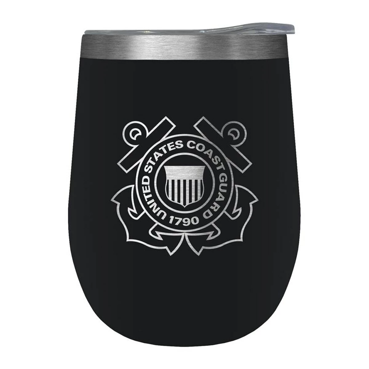 This U.S. Coast Guard Stealth wine tumbler is a great way to show off your support. It is powder-coated black matte, and vacuum insulated. Features laser etched graphics and includes an acrylic lid. Manufactured by Great American Products.