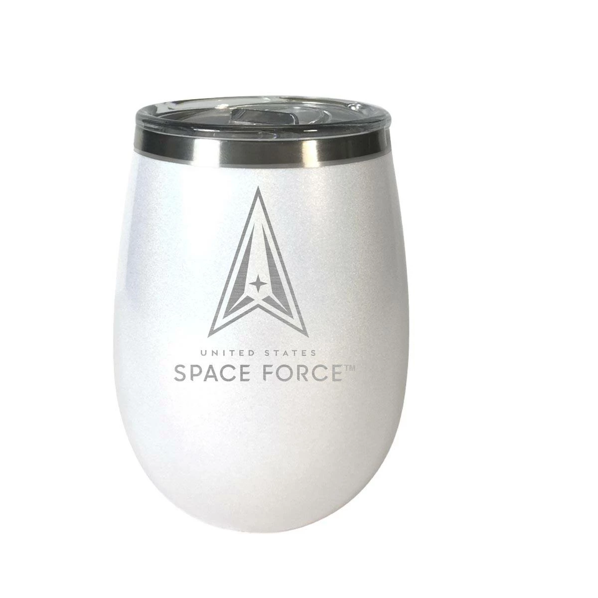 The opal wine tumbler is 10 ounces and is powder coated and vacuum insulated. Features laser etched graphics and includes an acrylic lid.Manufactured by Great American Products.